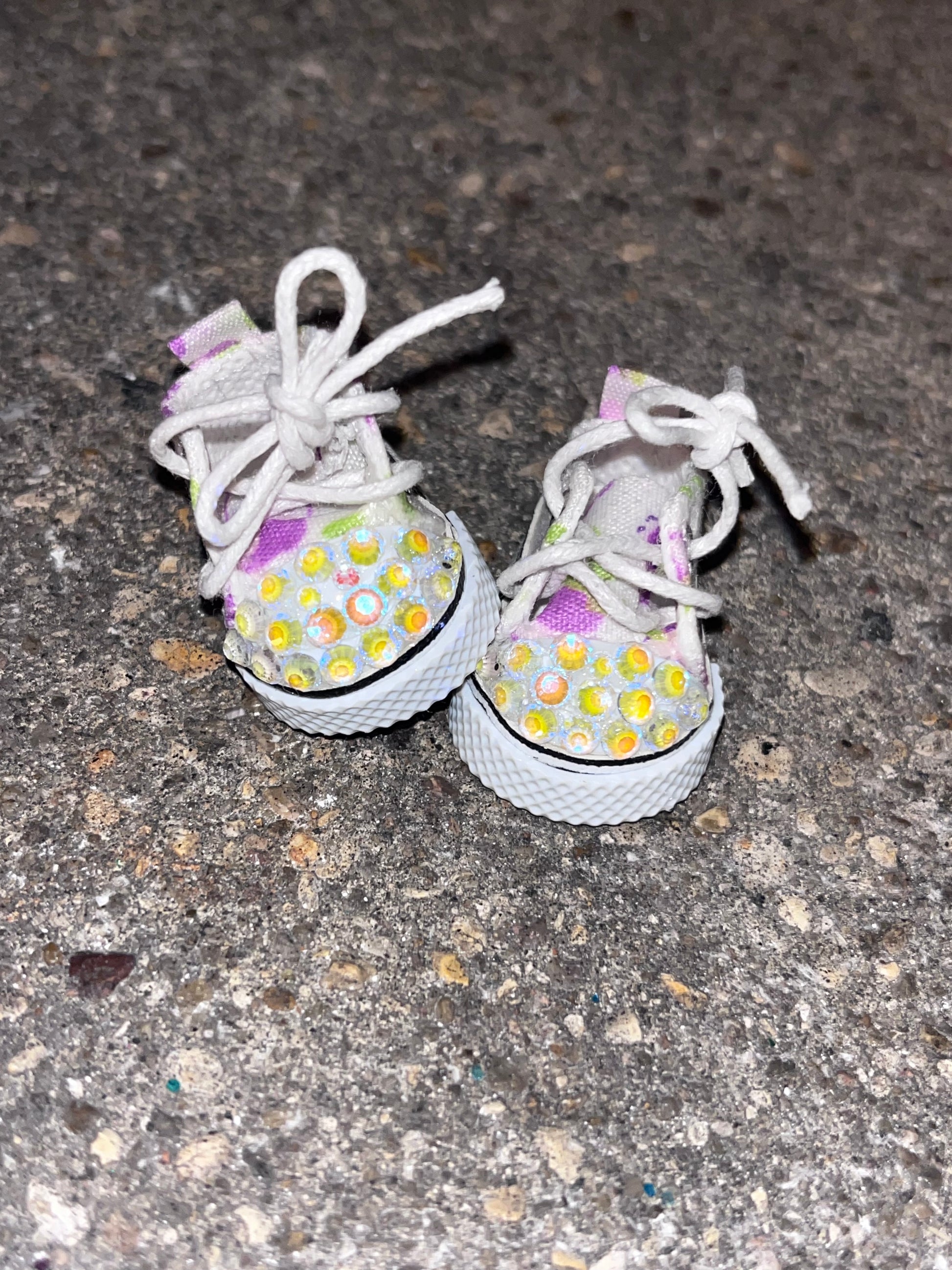 Monsters in Paris vous propose cette magnifique paire de baskets miniatures tie-dye violettes et jaunes, décorées de fleurs et strass irisés.Â
