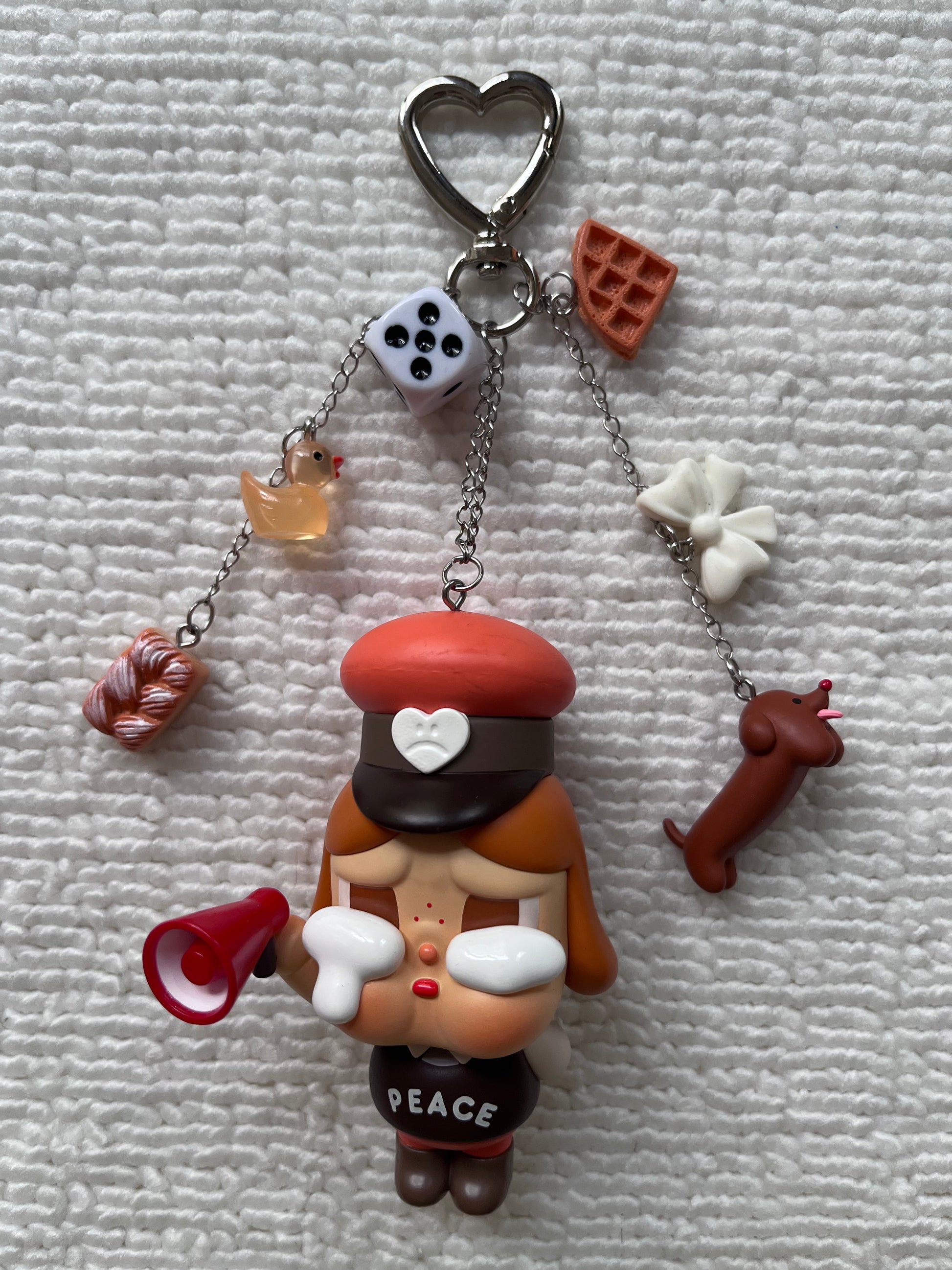 Les figurines utilisées sont des originales Pop Mart (série Crybaby Crying Parade). Chaque pièce est ensuite entièrement customisée et transformée à la main en porte-clés unique. Aucun modèle n'est identique, chaque création est pensée comme une petite œuvre d'art.
